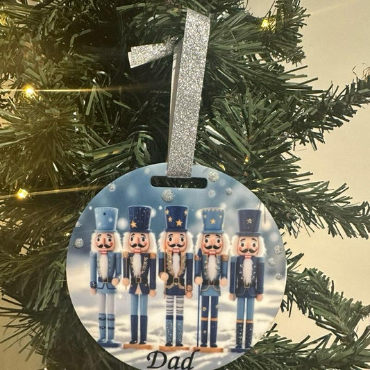 Blue nutcracker Christmas tree bauble acrylic glitter detail