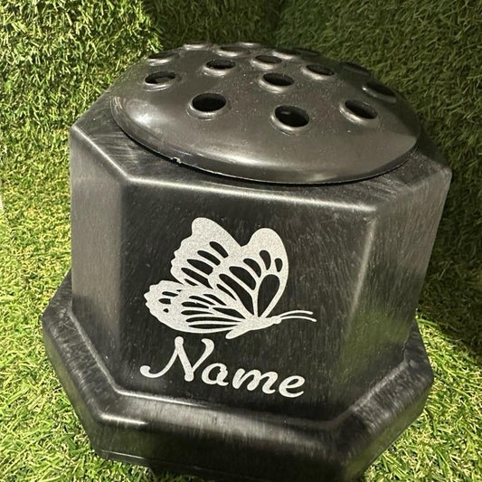 CEMETERY POT WITH PURPLE/LILAC/IVORY ROSEBUDS AND GYP (12 HEADS)